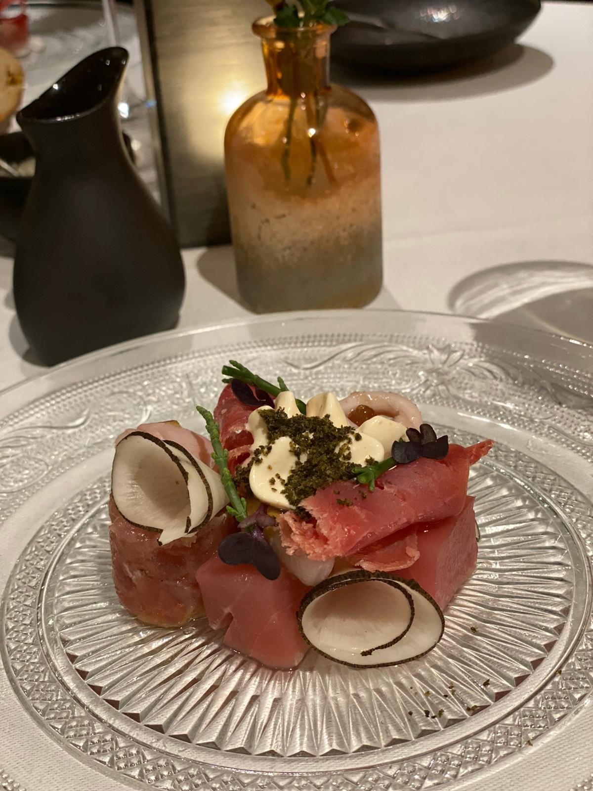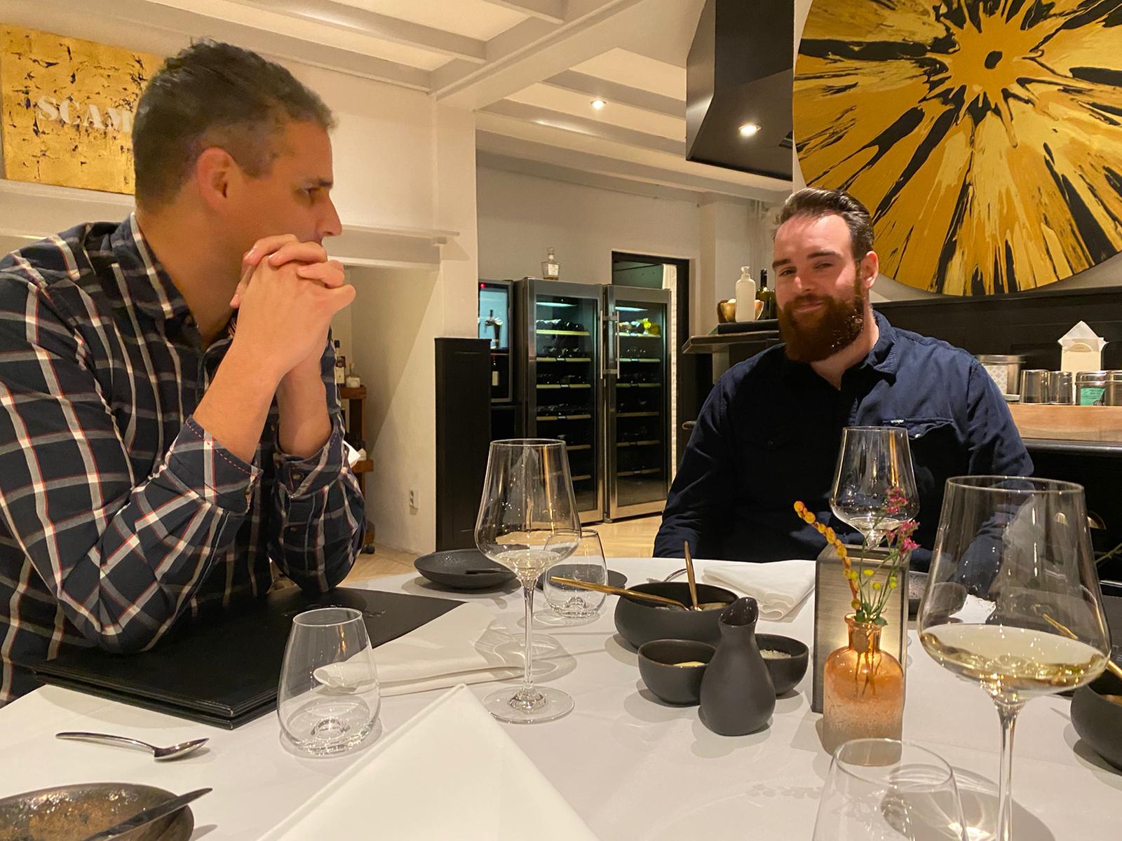 Wat we nog wel weten van de avond is dat Mike erg trots was dat hij zich opofferde en de hert afsloeg. En dat hij zeker een half uur zeer slechte grappen maakte met het woord "Hert" erin. Rik ging hier totaal niet in mee en boorde elke mogelijke opmerking van Mike direct de grond in. Rik heeft sowieso heel de avond alleen maar aandacht gehad voor een andere bepaalde gast. Hij was er zelfs dermate van onder de indruk dat het er tijdens de weg naar huis nog steeds over ging. De gangen volgen elkaar in een lekker tempo op, de flessen wijn gaan net iets sneller op. Nick krijgt het in zijn hoofd halverwege de avond dat hij perse rode wijn wil gaan drinken, de we laten de goddelijke witte wijn even staan voor een flesje rood. De kater die sommige de dag erna hebben wordt ook wel aan Nick en zijn rode wijn verweten. We moeten ook wel een beetje snel dooreten, want door de corona maatregelen moeten we ook om 22.00 uur uit het restaurant zijn.