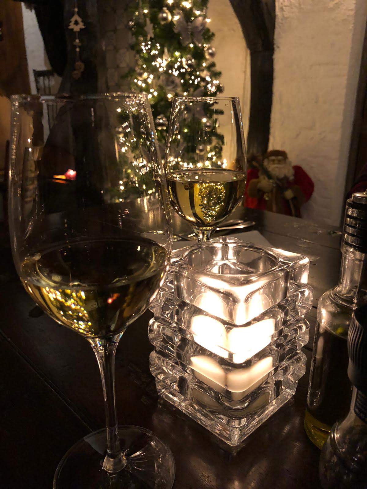 Bij binnenkomst worden we direct welkom geheten door de gastvrouw. Die leidt ons naar een tafel midden in het restaurant. Maar dan ook echt midden in het restaurant. Op een verhoging zodat iedereen ons kan zien en horen. Tim en Nick zitten hier al lekker gezamenlijk te wachten op ons en te genieten van een lekkere alcoholvrije versnapering. Want naast Sander zijn ook Tim en Nick op eigen vervoer naar het restaurant gekomen. Dit zal dus een rustig avondje gaan worden, met de helft van het gezelschap aan de fris. Maar voordat we kunnen gaan eten moeten we nog wel even snel een flesje wijn gaan nuttigen. De gastvrouw stelt alle vragen aan Erik, wat voor soort wijn? Waar moet ie naar smaken? Terwijl ze dit allemaal aan Erik vraagt, kijkt ze wel indringend Mike aan. Wat voor een beetje een ongemakkelijk gevoel zorgt bij laatstgenoemde. En om alles nog wat ongemakkelijker te maken zat er net echter Mike een erg creepy kerstman onder een kerstboom naar die jongen te staren. We hopen maar dat het een pop is, maar dat merken we wel als we binnenkort in onze slaap achterna worden gezeten door deze monster van een pop.