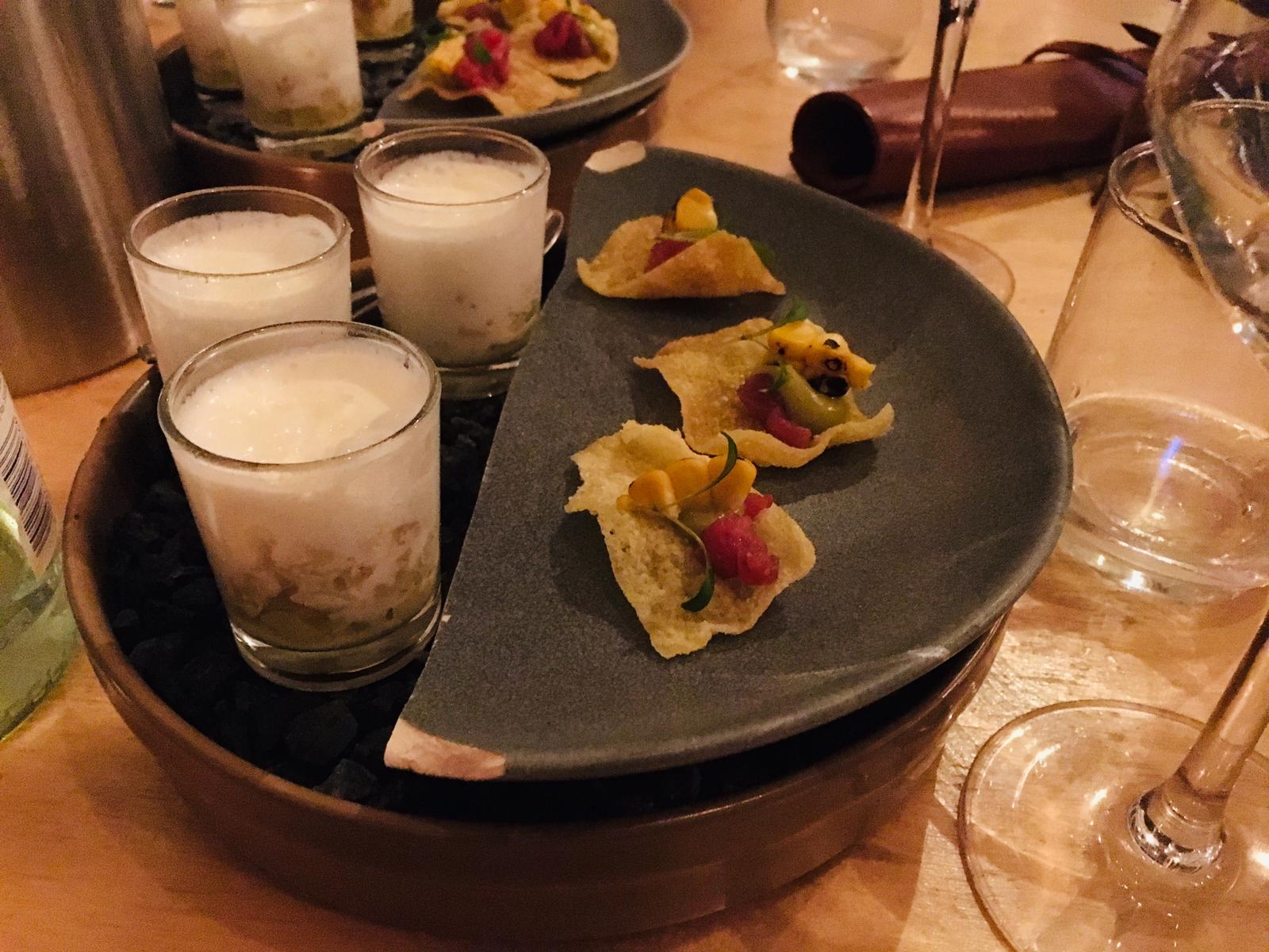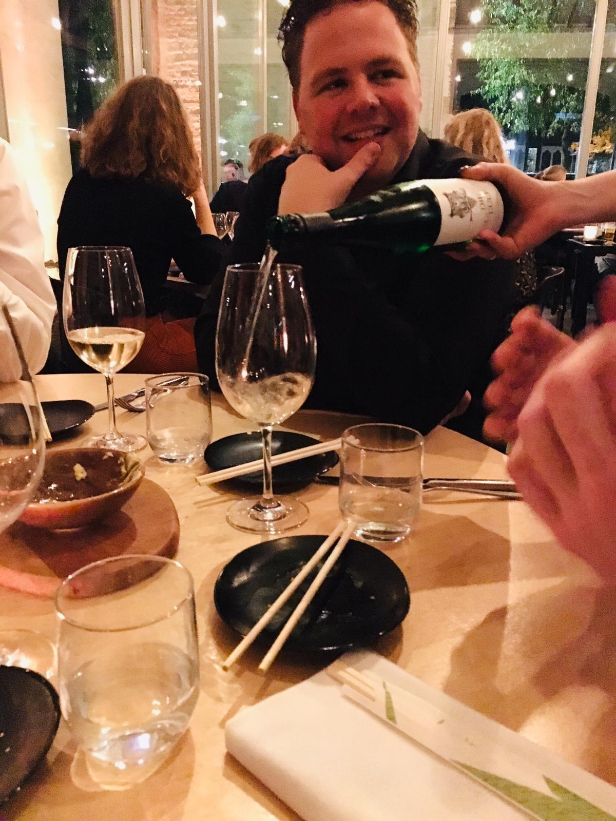 En de amuse was zeker geen bevlieging van de chef. Alle gerechten waren om te smullen. We kregen zeker niet de gerechten waar wij als vleesetende mannen anders ook voor hadden gekozen. Dat maakte heel de avond voor ons allen dus een avontuur. We begonnen met een heerlijke Corvina met kombucha, je weet wel dat spul waar alle healthfreaks ook lekker op gaan. En wij gingen er ook lekker op, het was om te smullen. Bij de vis werd ook een heerlijke wijn geschonken. En gelukkig hadden we voor een wijnpakket gekozen, dus werden we bij elke wijn getrakteerd op een mooi verhaal over de smaak en de afkomst van de wijn. Als snel waren we allen uitgekeken op de verhaaltjes van de wijn. Maar op onze favoriete tafeldame raakten we niet uitgekeken.