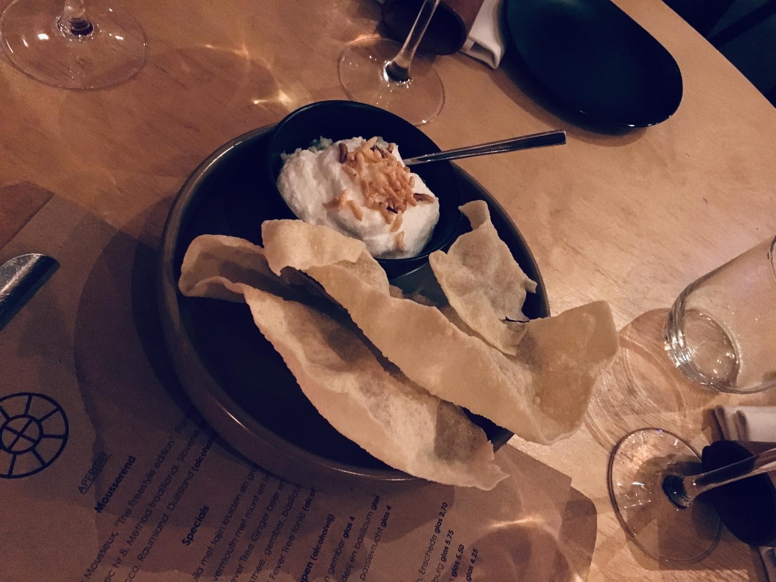 We kozen weer vrij unaniem voor een verrassingsmenu. Helaas was er deze keer geen mogelijkheid om eisen aan het menu toe te voegen. Dus werden we echt in het diepe gegooid. Tim begon zich meteen zorgen te maken dat hij weer een bospaddenstoelensoep kreeg. Maar gelukkig hebben we deze keer geen soep voorbij zien komen. In de besteketui zat naast het bestek ook nog een aantal eetstokjes dus tijdens het eerste gerecht gingen er direct een aantal heren los met stokjes.