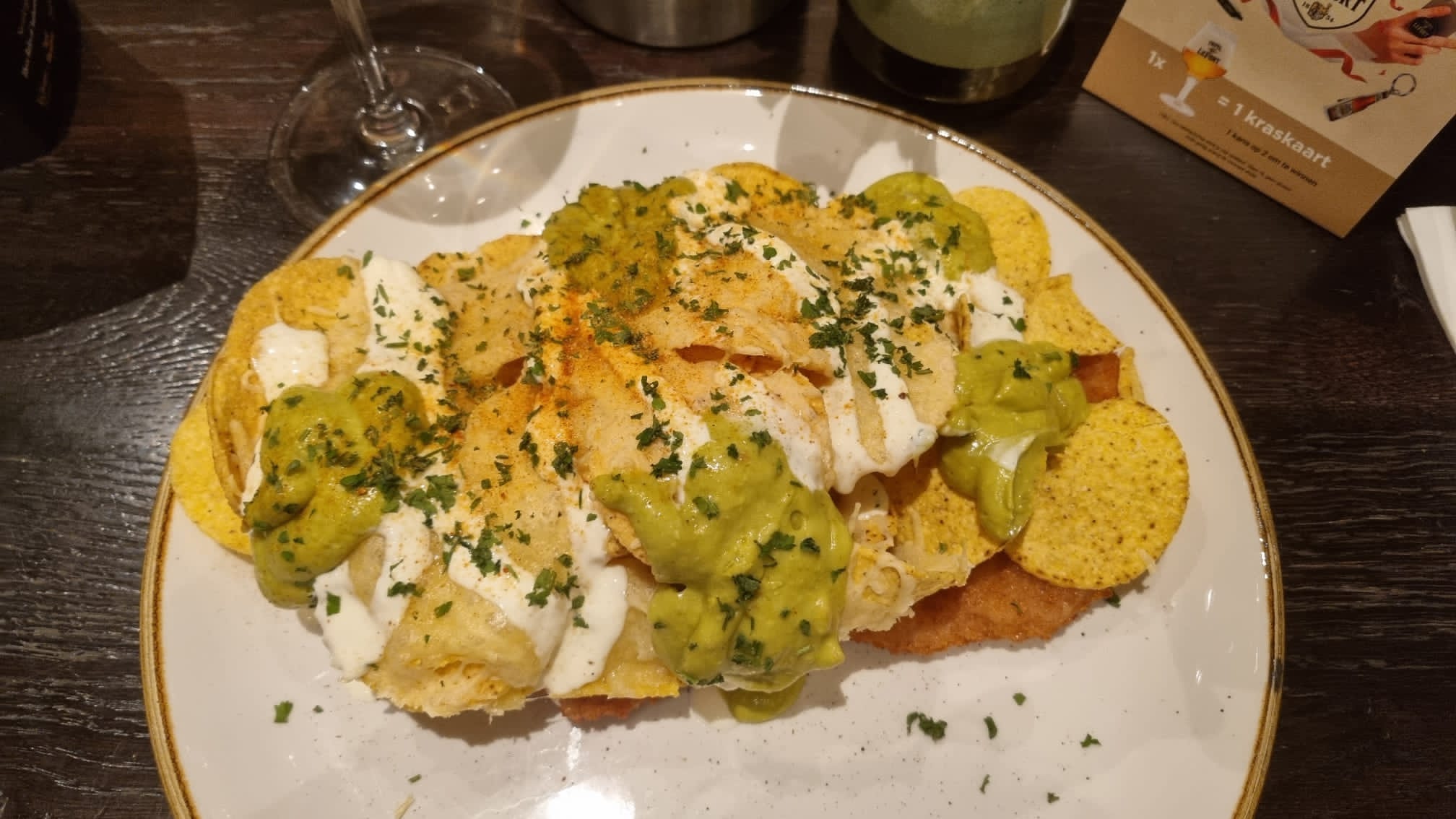 Chips met royaal guacemole voor de liefhebber. Pro-tip: er zit in dit gerecht werkelijk een schnitzel verstopt.
