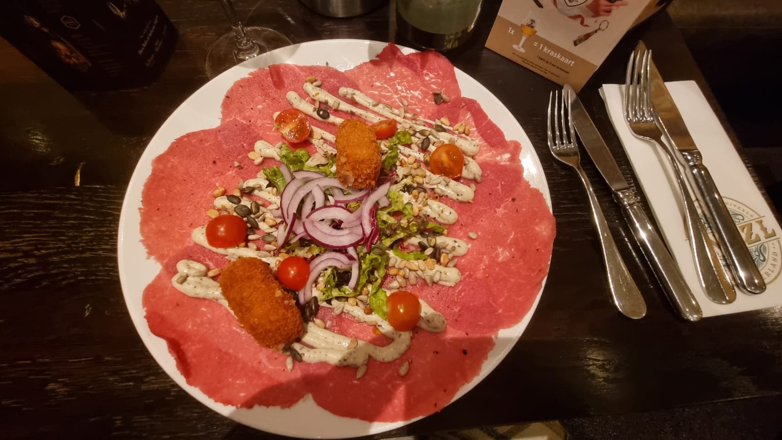 Na enig stoeien met de plaatselijke gebruiken, lukt het uiteindelijk een flesje vino en menukaarten te bemachtigen. We nemen bij het eerste onder andere Carpaccio Surf en truffel, hoewel er ook Thais red curry kroketjes voorbij komen. Afijn, er komt rood vlees onder de neus door.