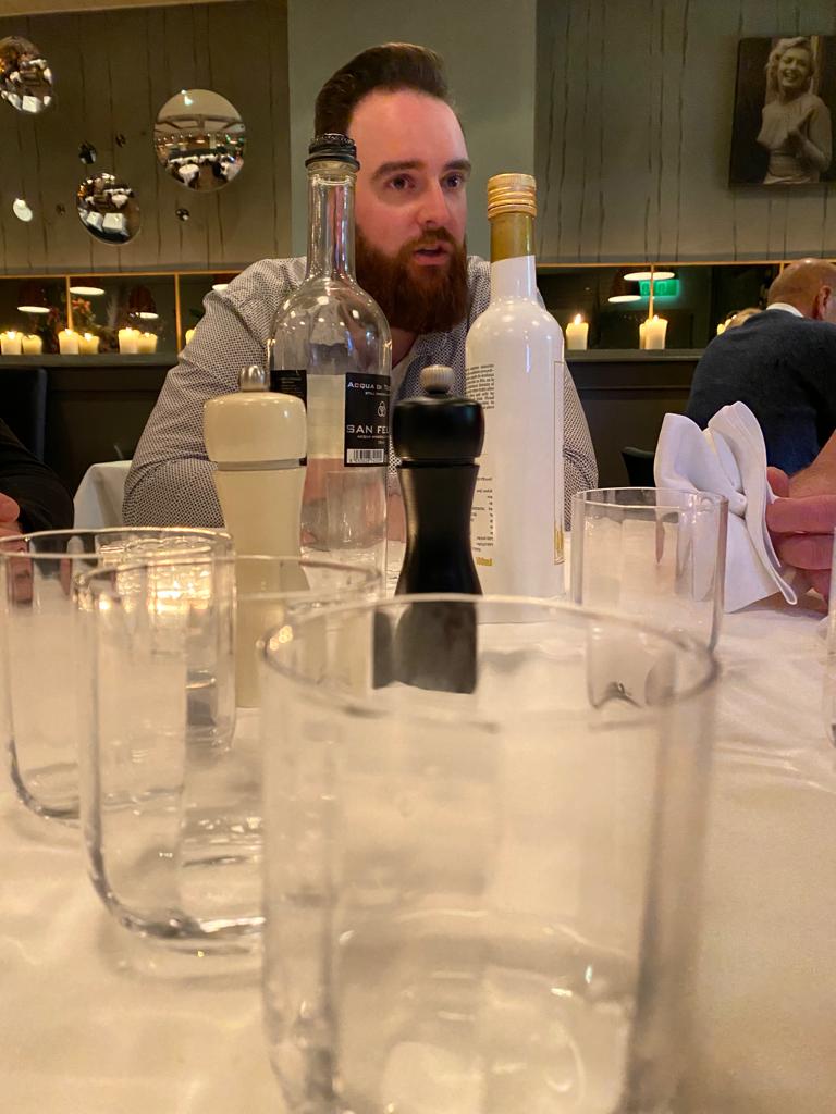 Onze ober heeft grote gelijkenissen met Thierry Baudet. Maar de brabantse tongval verraad hem al snel. We kregen snel een uitleg van hem over het restaurant "de wc is daar zo" en een heerlijke witte wijn om de avond echt mee te beginnen. Terwijl wij nog aan het bijkomen waren van de voettocht begon de brabantse neef van Thierry Baudet al met inkakken is bijpakken. Dus hij wist precies wat voor publiek hij vandaag mocht bedienen. Wij blij, tot de dag van vandaag weten we niet of hij er ook echt blij mee is. Elke keer als hij aan de tafel komt is er toch een berg zenuwachtig gedoe.